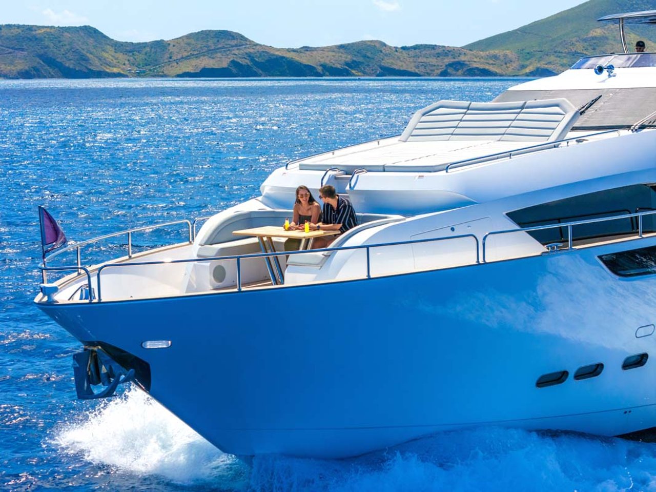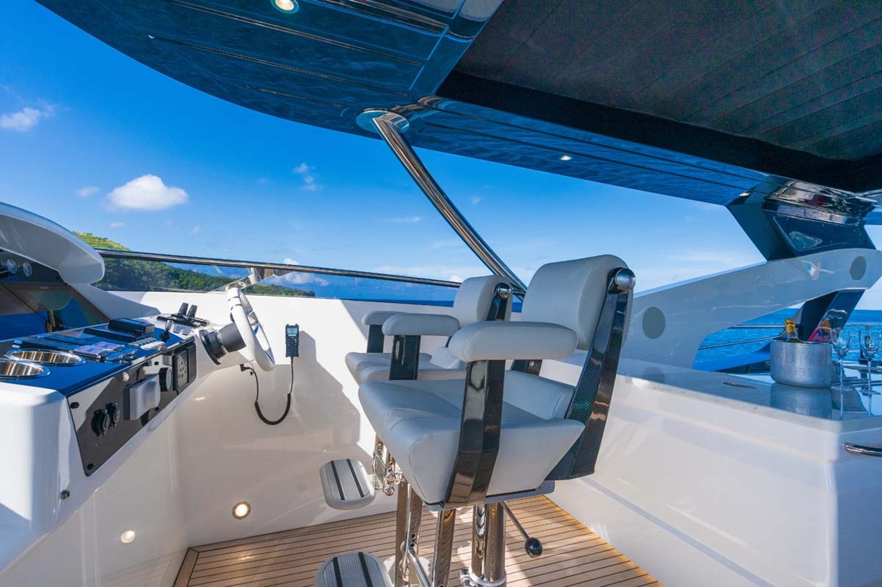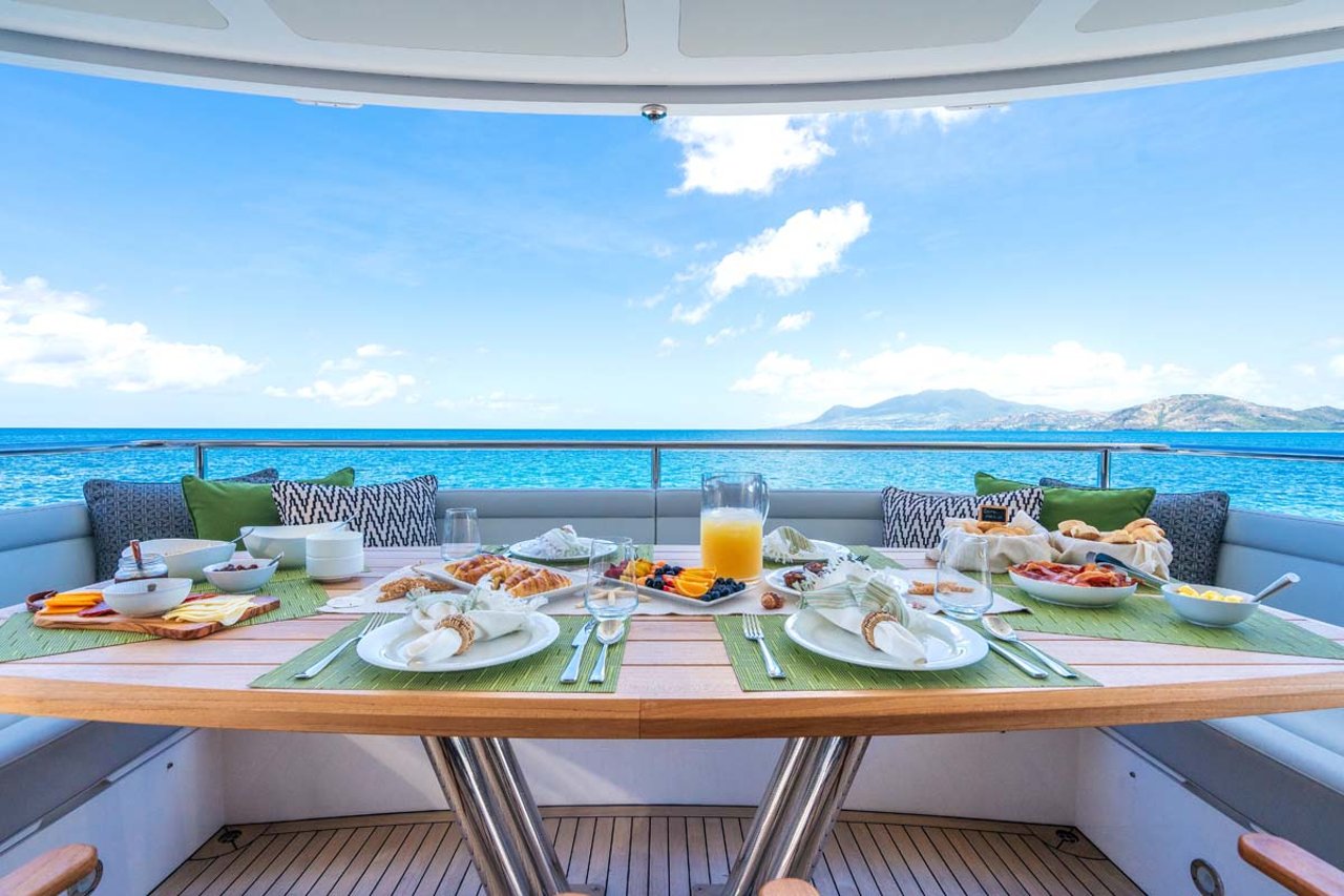 Her aft deck leads down to the swim platform. Forward on the bow you’ll find an enormous bunny pad as well as a table and seating area. When not in the water you’ll likely spend most time on the flybridge which offers a Jacuzzi tub aft a wet bar and large seating area for alfresco dining and sundown cocktails served by your professional crew of 4.