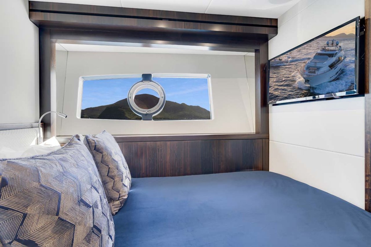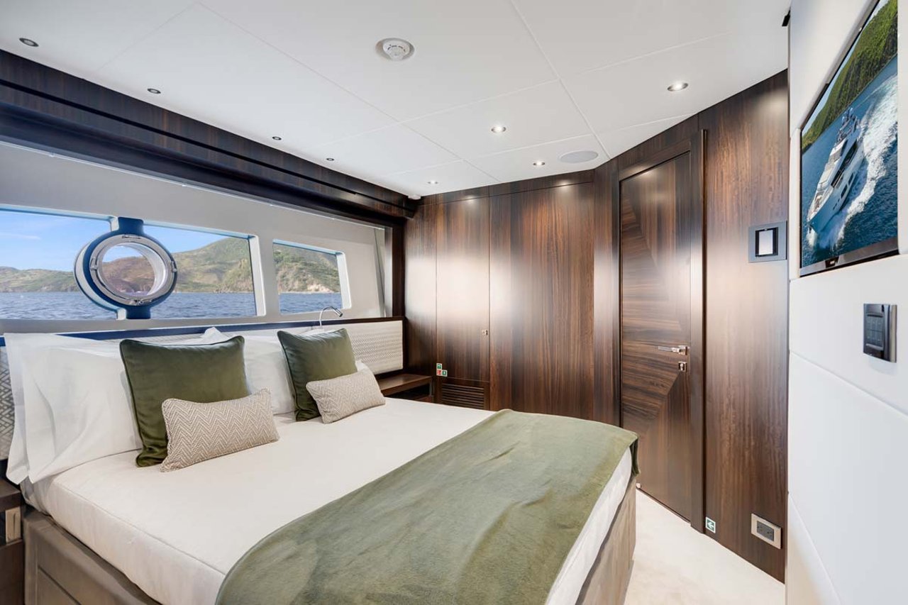 Her well-thought-out design makes the most of the space onboard. Her on-deck master stateroom features large windows for plenty of light, leading down to a large dressing area and then down to the bright and spacious master bathroom. Features include a large walk-in shower with bench seating, a rain shower, a vanity with dual sinks and an enclosed WC.
