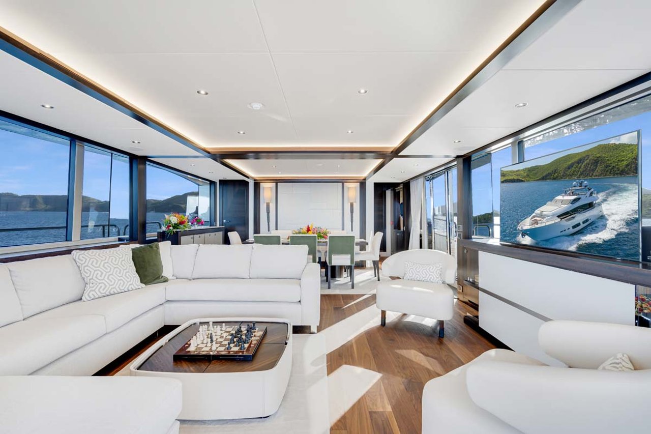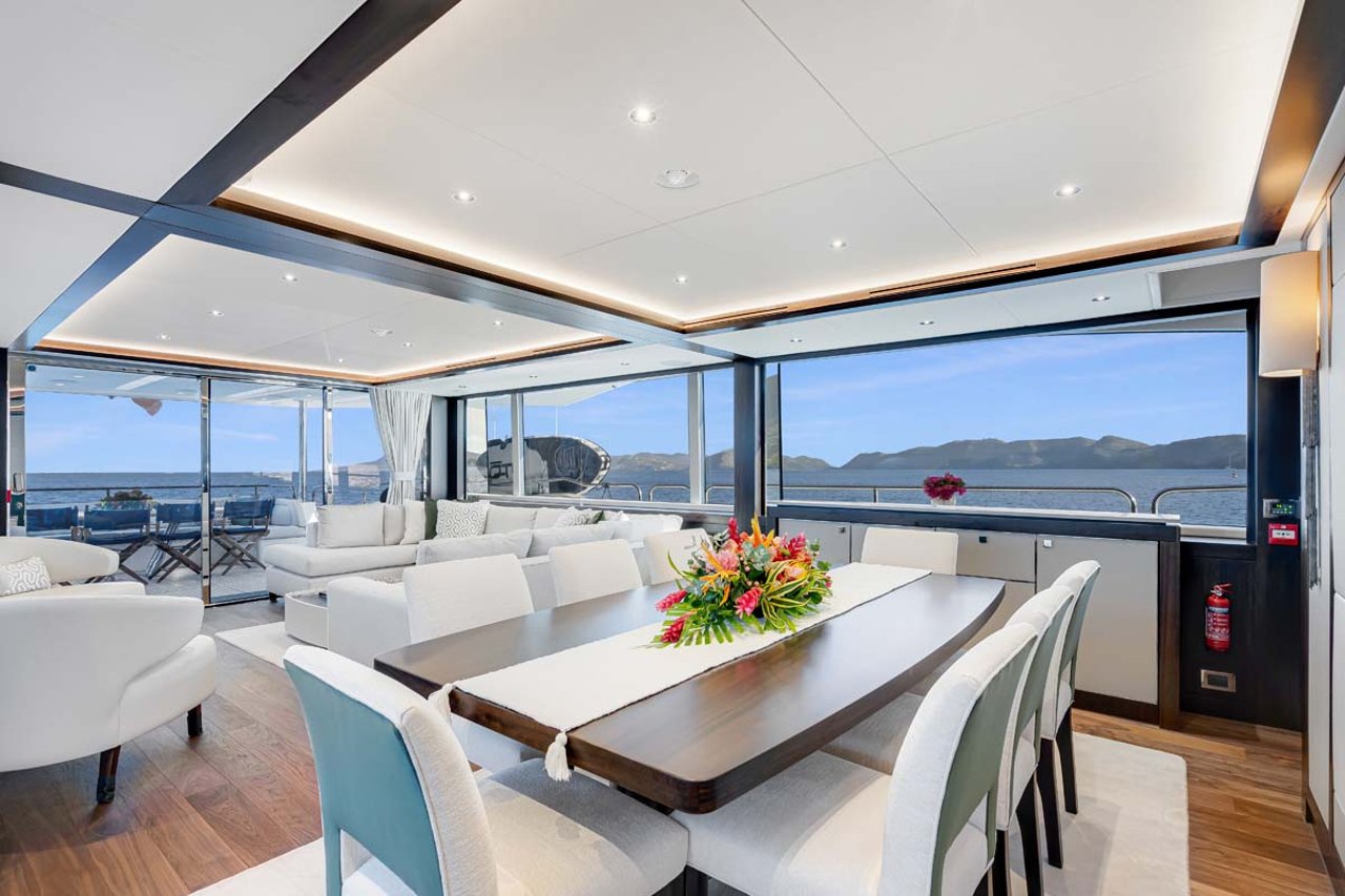 Her main salon and dining areas are neutrally decorated and again offer plenty of natural light with a full sliding glass door to starboard which can open up to a retractable balcony area.