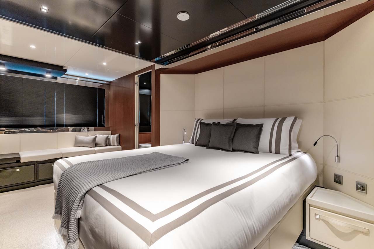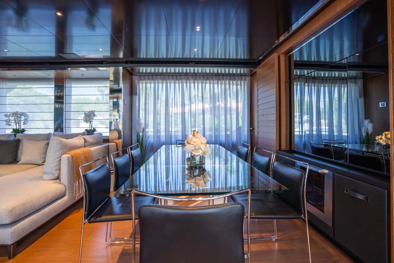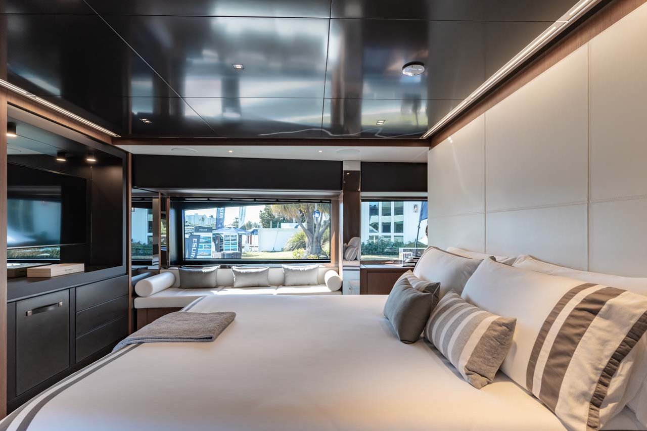 Her elegant interior is highlighted by full length side windows that open up onto the walk around deck on either side, allowing guests to embrace the ocean breeze. Forward of the dining table which seats eight, you will find the full beam owner’s suite, featuring a king size bed and comfortable lounge area. The ensuite features a double vanity and a spacious shower.