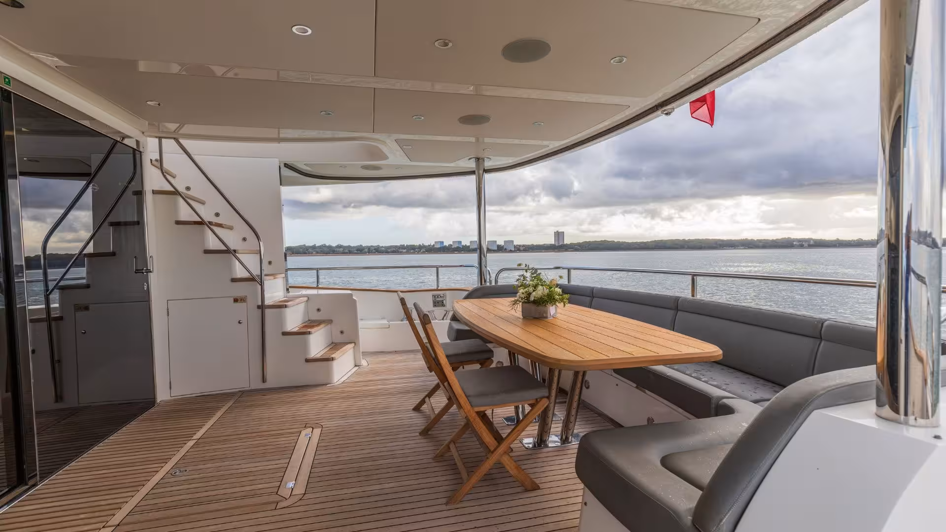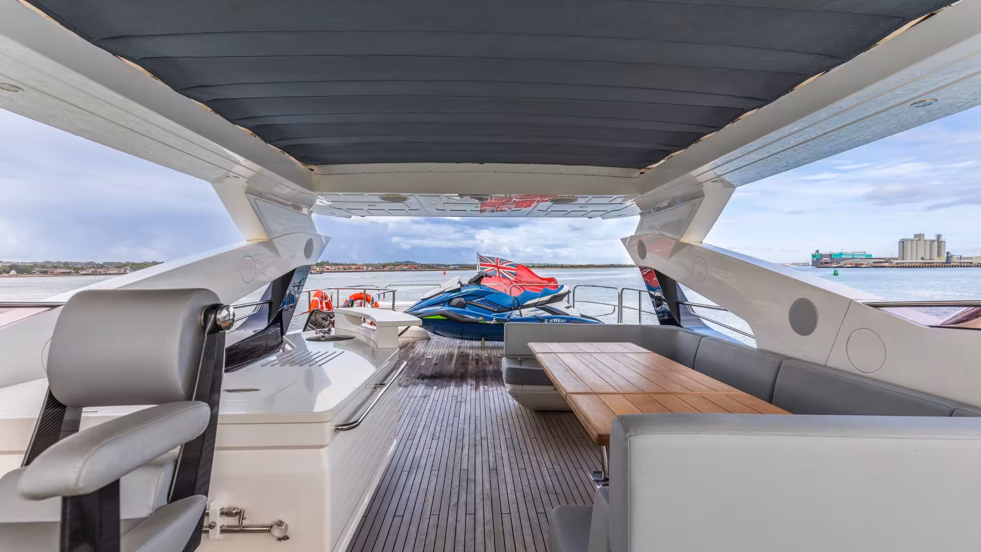 The flybridge offers generous entertaining space with an exterior helm station, wet bar, dining area and sunpads. A jetski is secured aft on chocks and deployed via the onboard crane. The cockpit features a large fixed dining table with surrounding seating, creating a comfortable outdoor dining area. Side decks provide easy access forward, while the bow offers a substantial sunpad and a smaller seating area with table. A side door from the Master Cabin also provides direct access to the bow terrace. The bathing platform carries a SUR tender with covers and chocks and provides access to the crew cabin, engine room and additional storage.