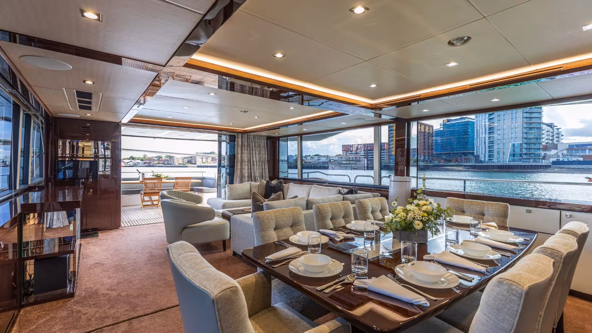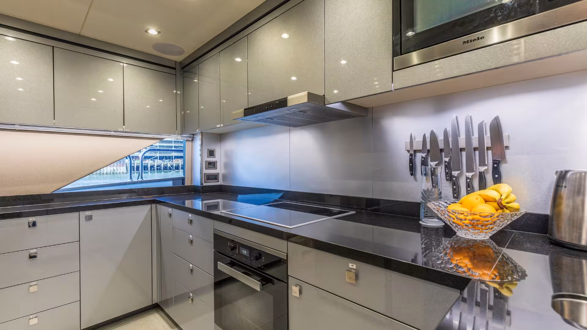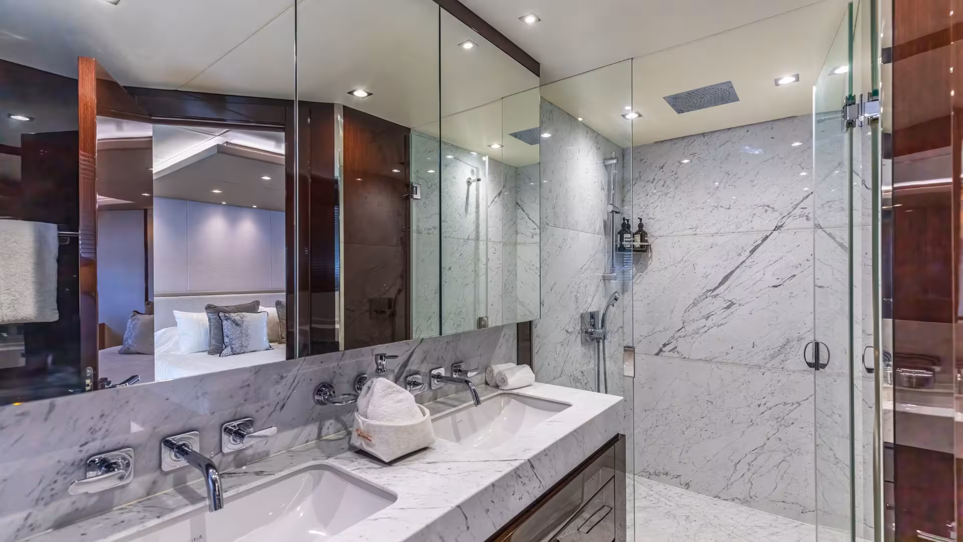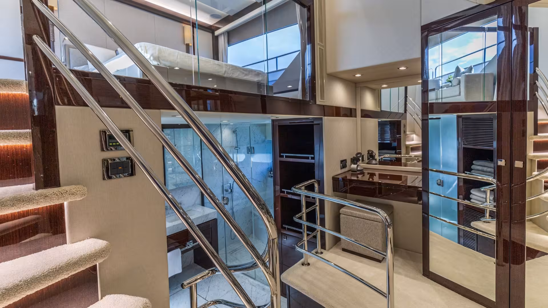 Inside, the yacht is finished in dark gloss wenge cabinetry with light carpets, creating a modern and elegant interior. The standout full-beam Master Cabin benefits from large windows, a private bow access door, a dedicated dressing area with vanity and storage, and a spacious en-suite bathroom arranged across split levels. Guest accommodation includes three additional cabins: a large VIP cabin that could serve as a second Master, plus two twin cabins.