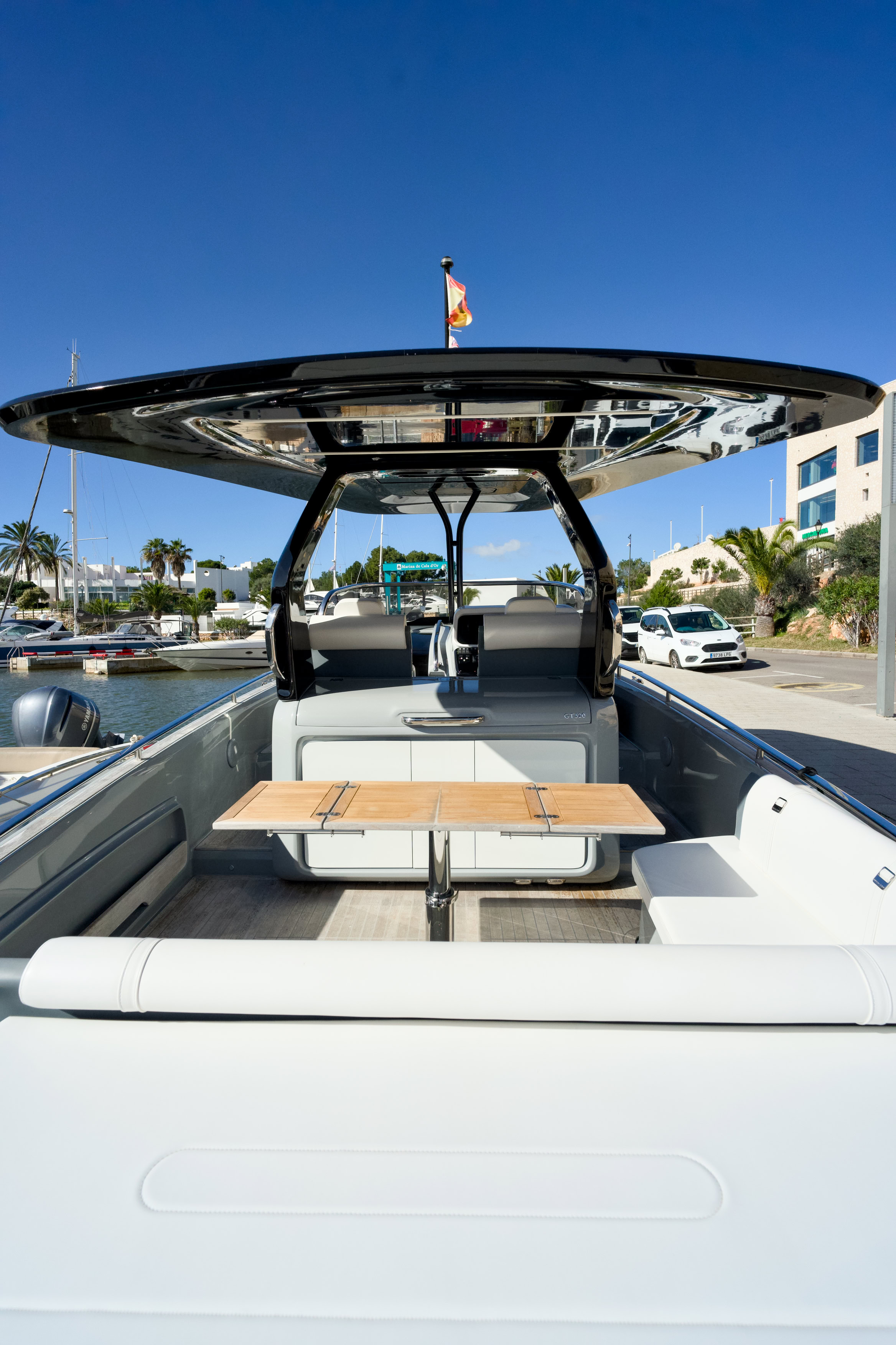 Ample sunbathing forward, plus a comfortable, spacious and flexible aft cockpit, combined with a plentiful bathing platform, make this a very popular option for the Mediterranean. Twin helm seats give fantastic all-around spatial awareness, and controls are close to hand. The bulwarks are high enough to make a passenger feel safe, and a secure handrail ensures there is always a secure position on board. The rake of the windscreen is very protective, and the carbon hard top is great protection from direct sunlight, as well as the optional sun canopy aft, which gives fantastic shelter over the dining area in the cockpit.